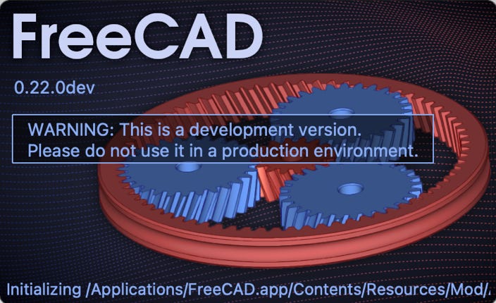 Bei FreeCAD nutze ich fast immer die aktuellen Daily Builds und hatte bisher noch keine Schwierigkeiten (hier abgebildet V0.22dev). Die offizielle „stabile Version“ von FreeCAD ist V0.21. Sie wird für macOS für Intel CPUs und Apple Silicon angeboten.