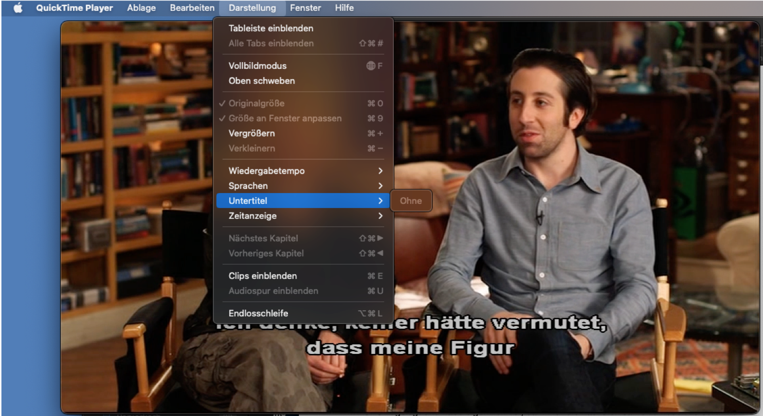 Auf diesem Screenshot sieht man, dass Untertitel angezeigt werden (in Deutsch), Quicktime aber behauptet, es seien gar keine vorhanden - womit auch ein Abstellen nicht möglich ist.